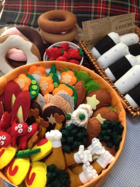 伊藤もともとデザインの勉強をしたり、モノを作る事は好きだったんだけど、チャイルドマインダーという資格を取って、託児所やトワイライトスクールで働き始めて、子ども達と接するようになった時に、子ども達に楽しく遊んでもらいたいなって思って「お弁当」を作ったの。そのあとから作ったフェルト作品も、子ども達に「うきうき」「わくわく」しながら遊んで欲しい、という想いで作ってる。だから、”フェルト”と”子ども達との関わり”というのは私の中でセットなんです。